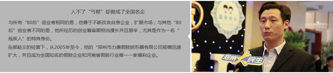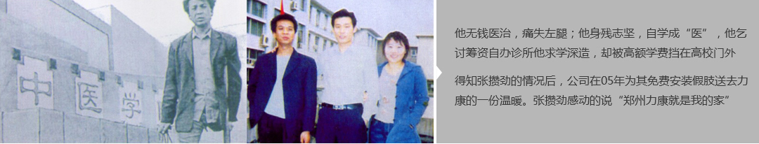 鄭州市力康假肢矯形器有限公司(簡稱力康),是一家專業(yè)從事假肢矯形器的設(shè)計(jì)、研發(fā)、制作及裝 配的專業(yè)機(jī)構(gòu)。成立于1992年是河南省唯一一家福利企業(yè)。力康下設(shè)業(yè)務(wù)部、技術(shù)部、住院部、康復(fù) 部、售后服務(wù)部,并配有現(xiàn)代化的裝配車間和功能齊全的訓(xùn)練大廳,為殘疾朋友康復(fù)訓(xùn)練提供了可靠 保障。總經(jīng)理穿戴假肢多年,有著豐富的臨床經(jīng)驗(yàn)和親身體會(huì);多年來,力康已為全國幾十萬名殘疾 朋友安裝上舒適、美觀、耐用的假肢和矯形器具,使他們更大限度地恢復(fù)了正常的工作和生活。“產(chǎn) 品即人品”的質(zhì)量理念、先進(jìn)的技術(shù)、實(shí)惠的價(jià)格、完善的售后服務(wù)是力康取勝的法寶……